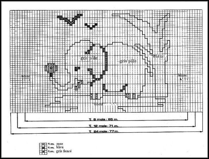Comme le dos, mais après les côtes, tric. 2 - 8 - 14 rgs en blanc. Cont. en suivant la grille, après le dernier rang term. jersey endr. en blanc.