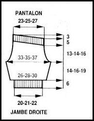 À 20 - 22 - 25 cm de haut. tot., former l'entrejambe en rab. à droite ts les 2 rgs 1 fs 3 m., 2 fs 2 m., 2 fs 1 m., puis ts les 4 rgs 6 fs 1 m. et simultanément à gauche ts les 2 rgs 3 fs 1 m., puis ts les 4 rgs 12 fs 1 m.