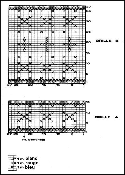 Monter 23 - 25 - 27 m. en ruge. Tric. 3 cm côtes 1/1 en répart. 8 augm. au dernier rg. Cont. droit jersey endr. sur les 31 - 33 - 35 m. obtenues en tric. 4 rgs rouge, 1 rg bleu, 11 rg blanc, 1 rg bleu. Cont. en rouge.