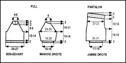 À 18 - 21 cm de haut. tot., rab. de ch. côté ts les 2 rgs 1 fs 2 m., 2 fs 1 m. Cont. droit sur les 55 - 59 m. rest. À 12 - 14 cm de haut. d'entrejambe, laisser en attente à droite ts les 2 rgs 5 fs 9 m. Reprendre toutes les mailles. Tricoter 5 cm côtes 1/1 et laisser en attente.