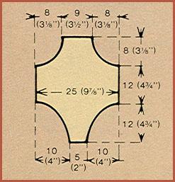 Repasser le travail sur l'envers à la pattemouille, et faire la bordure: avec la couleur rouge, faire un tour de m.s. sur les 4 côtés, en répartissant 20 m.s. sur la longueur du côté de chaque carré. Aux angles, faire 3 m.s. dans la m. marquant chaque angle. À la fin du tour, faire 1 m. en l'air et tourner, pour travailler en revenant sur le tour précédent. Faire à ce 2ème tour, *1 m.s., 1 feston, passer 2 m.s. du tour précédent,*. À la fin du tour, arrêter.