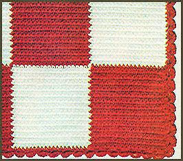 Avec la couleur rouge, monter une chaînette de 140 m. en l'air pour le travail, plus 1 m. en l'air pour tourner. Travailler au point quadrillé bicolore, en faisant 7 fois: 20 m. en rouge et 20 m. en blanc. Faire ainsi 28 rangs. Au 29ème rg, placer les couleurs en quinconce. Permuter ainsi la place des couleurs, à chaque 29ème rg. À la fin du 7ème carreau en hauteur, arrêter.