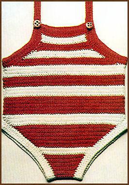 Commencer à l'entrejambe. Avec le rouge, monter une chaînette de 10 m. en l'air, puis 1 m. en l'air pour tourner. Travailler en rayures, dans les couleurs suivantes: