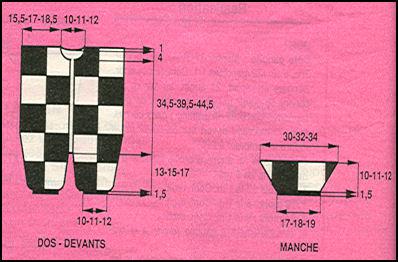 Comme le dos jusqu'à l'entrejambe. À 13 - 15 - 17 cm de haut. de jacquard, cont. sur les 50 - 54 - 58 rgs obtenues en augm. encore côté gauche ts les 10 rgs 1-2-3 fs 1 m. (on obtient 51 - 56 - 61 m.).