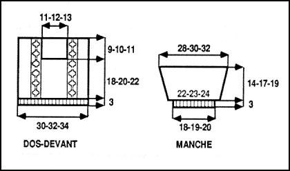 Faire les coutures d'épaules. Poser les manches au point de mailles sur 14 - 15 - 16 cm de part et d'autre des coutures d'épaules. Poser le col au point de mailles le long des parties verticales de l'encolure devant et au bord de l'encolure. Dos. Coudre les 2 bords étroits du col en les superposant contre les mailles rab. à l'encolure devant. Le replier en dehors. Term. les coutures.