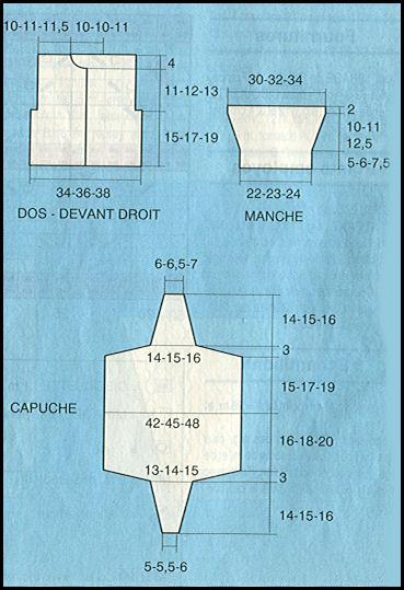 À 8 - 9 - 10 cm de haut. d'emmanchures de haut. tot., rab. les 11 - 11 - 13 m. centrales. Cont. ch. côté séparément en rab. côté encolure ts les 2 rgs: 1 fs 3 m., 2 fs 2 m., 3 fs 1 m.