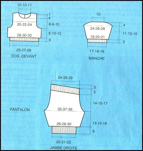 À 14 - 15 - 17 cm de haut. d'entrejambe, laisser en attente à droite ts les 2 rgs 1 fs 27 - 33 - 39 m., 5 fs 10 m. Reprendre tutoes les mailles et tric. 5 cm en côtes 1/1 en blanc. Rab. souplement