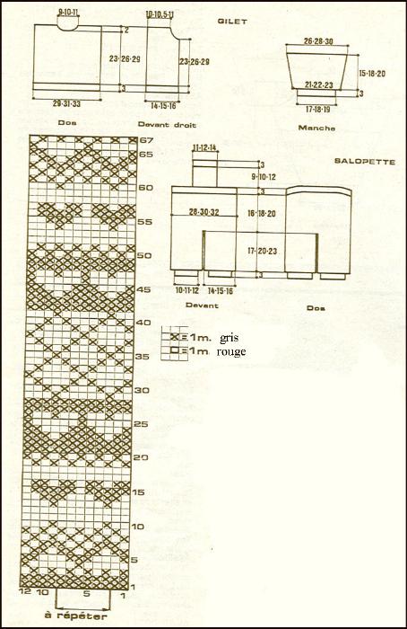 Monter 109 - 113 - 117 m. en rouge. Tric. 6 cm en côtes 1/1. Cont. droit jacquard en commençant