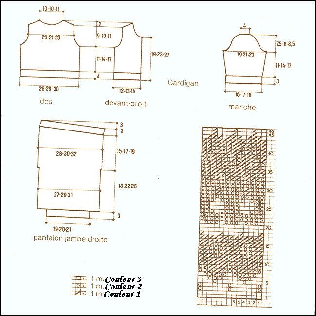 Monter 25 - 27 - 29 m. en C3. Tric. 3 cm côtes 1/1. Cont. droit jacquard en commençant comme au dos.