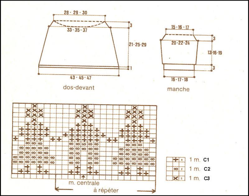 Reprendre les 45 - 46 - 48 m. de gauche du dos, les 49 - 51 - 55 m. d'une manche, les 91 - 93 - 97 m. du devant, les 49 - 51 - 55 m. de l'autre manche et les 46 - 47 - 49 m. de droite du dos. Tric. 1 rg env. en blanc en augm. 4 m. à droite et en répart.