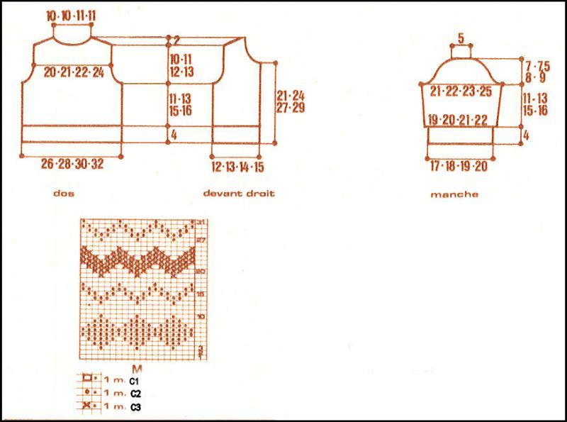 Monter en C1 45 - 49 - 51 - 55 m. Tric. 4 cm en côtes 1/1. Cont. droit jacquasrd (centrer la m. M)