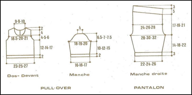 Reprendre les 54 - 58 - 62 m. de la jambe droite et les 54 - 58 - 62 m. de la jambe gauche. Tric. 22 rgs point mousse rayés comme au bas des jambes et rabattre.