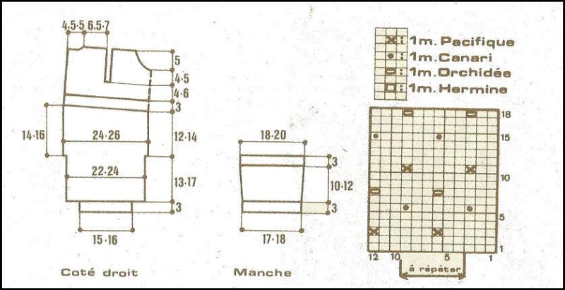 Tric. côte 1/1 3 rgs pacifique, 3 rgs hermine, 3 rgs canari, 3 rgs hermine, 3 rgs orchidée. Cont. jacquard en commençant par la m. 6 de la grille.Emmanchures