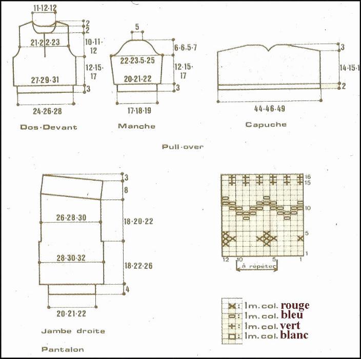À 18 - 20 - 22 cm de haut. depuis l'entrejambe, laisser en attente côté droit ts les 2 rgs 1 fs 35 - 37 - 40 m., 4 fs 7 m. Reprendre toutes les mailles. Tric. en côttes 1/1 rayées: 2 rgs blanc, 3 rgs vers, 2 rgs blanc, *3 bleu, 2 rgs blanc, 3 rgs rouge, 2 rgs blanc, 3 rgs vert, 2 rgs blanc*