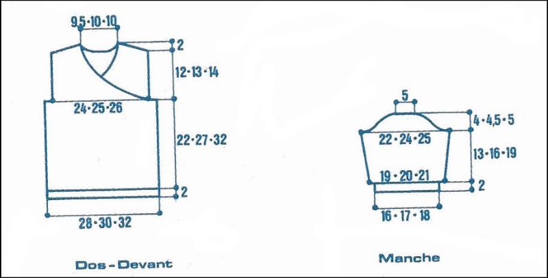 Monter 99 - 107 - 115 m. en blanc, tric. 2 cm en côtes 1/1 et laisser en attente, mais à mi-hauteur, former 3 boutonnières de 2 m., la première à 7 m. du bord, les autres espacées de 8 - 9 - 10 m.