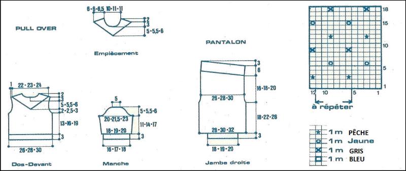 Monter 101 - 105 - 109 m. en jaune. Tric. 6 cm en côtes 1/1. Cont. droit jacquard.