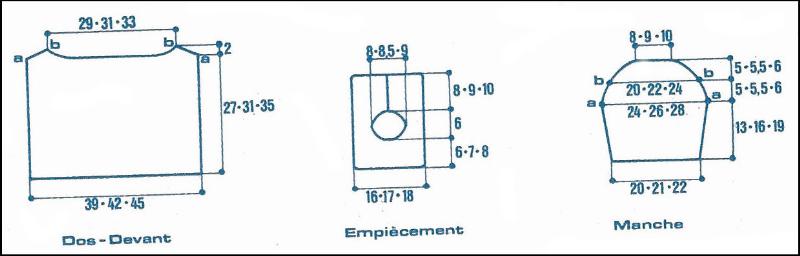 Dim. ensuite comme suit: *2 - 2 - 3 m. endr, 2 m. ens. endr.* Rép. de * à * tout le tour. Tric. 2 - 2 - 3 tours sans dim.
