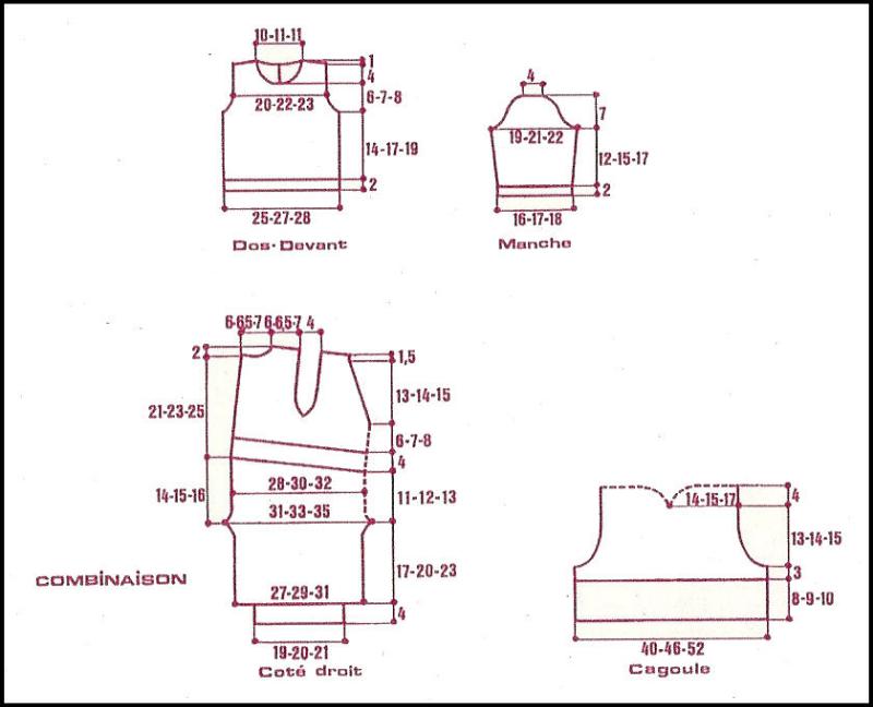 À 24 - 26 - 28 cm de haut. tot. rab. la m. centrale, terminer ch. partie séparément en laissant en attente côté intérieur ts les 2 rgs 4 fs 1 m., 2 fs 2 m., 1 fs 3 m. et les 21 - 24 - 28 m. rest. en 1 fois.Bordure de la cagoule