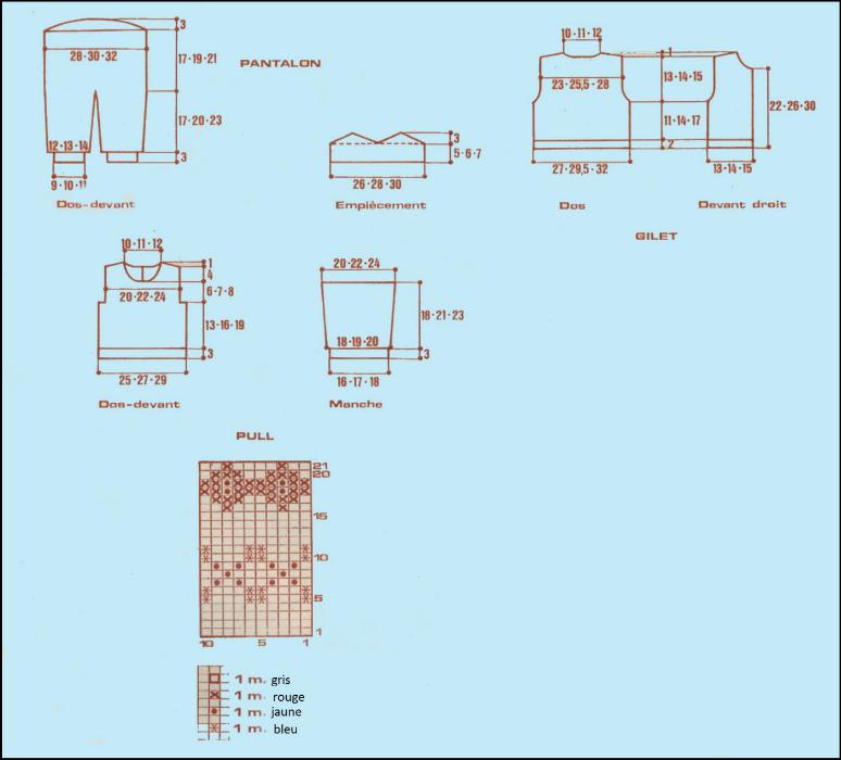 Monter pour celles des emmanchures 99 - 105 - 111 m. en gris, pour celles des devants 79 - 93 - 107 m. en gris, pour la bordure d'encolure 111 - 115 - 121 m. en gris. Tric. en côtes 1/1 5 rgs en gris, 2 rgs en rouge, 6 rgs en gris et laisser en attente.