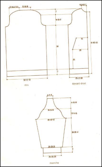 À 45 - 46 - 48 cm de haut. tot., former l'arrondi en rab. de ch. côté ts les 2 rgs 1 fs 2 m., 9 - 10 - 11 fs 1 m., 2 fs 2 m., 1 fs 1 m. Cont. droit sur les 9 - 11 - 11 m. rest. encore 11 - 12.5 - 14 cm. Fermer.