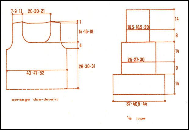 À 29 - 30 - 31 cm de haut. de corsage, rab. de ch. côté ts les 2 rgs: 1 fs 5 m., 1 fs 4 m., 1 fs 3 m., 1 fs 2 m., 2 fs 1 m.