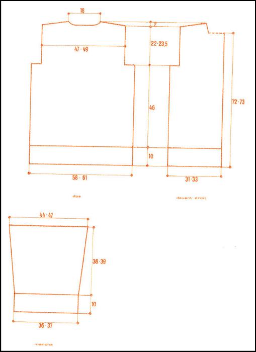 Reprendre les 11 m. laissées au devant droit, monter 1 m. au bord intérieur et tric. droit sur ces 12 m. environ 16 cm afin d'atteindre le milieu dos.