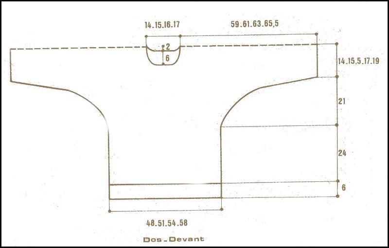 À 65 - 66.5 - 68 - 70 cm de haut. tot. (le milieu du pull est atteint), cont. en augm. pour l'encolure ts les 2 rgs 2 fs 3 m., 1 fs 10 - 11 - 12 - 13 m. Tric. droit 3 cm et laisser en attente. Tric. l'autre côté en sens inverse. Reprendre toutes les mailles en ajoutant 1 m. entre elles. Tric. droit environ 9 - 10.5 - 12 - 14 cm et dim. en sens inverse des augm. du dessous de bras.