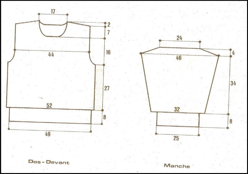 À 16 cm de haut. d'emmanchures, rab. les 9 m. centrales. Term. ch. partie séparément en rab. côté encolure ts les 2 rgs 1 fs 3 m., 1 fs 2 m., 3 fs 1 m.