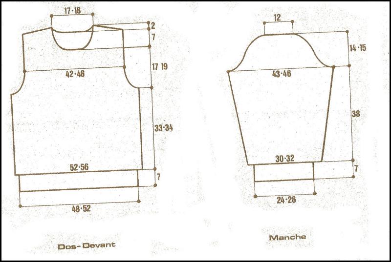 À 17 - 19 cm de haut. d'emmanchures, fermer les 10 - 12 m. centrales. Cont. ch. côté séparément en rab. côté encolure ts les 2 rgs 1 fs 3 m., 2 fs 2 m., 6 fs 1 m.