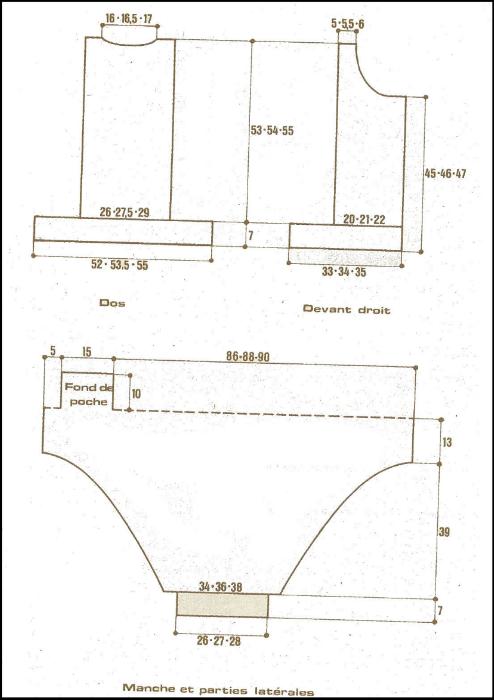 Monter 6- 62 - 64 m. Tric. 7 cm en côtes 2/2, mais à 3 cm de haut., former 2 boutonnières verticales de 1.5 cm de haut., la premières à 5 m. du bord, la 2ème à 13 - 14 - 15 m. de la première. À 7 cm de haut., laisser en attente côté gauche
