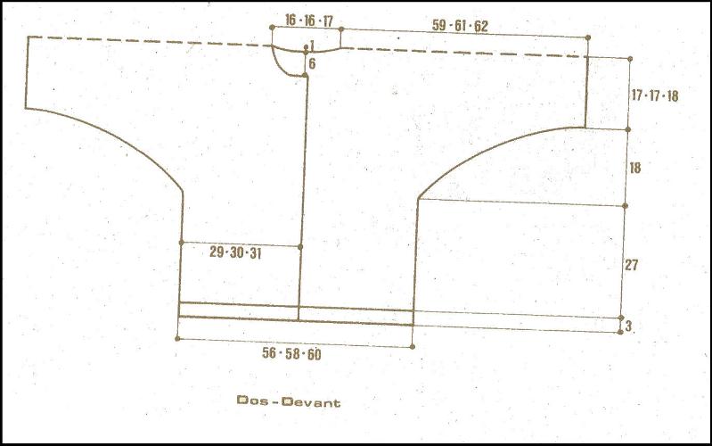T.42: 9 fs 2 m., 5 fs 7 m. On obtient 185 m.Cont. droit 15 - 15 - 16 cm sur toutes ces mailles, puis fermer les 21 - 21 - 23 m. centrales. Cont. ch. côté séparément.