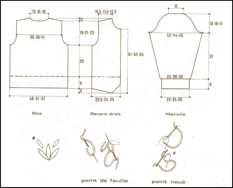 T.36: remplacer le dernier S.D. par 1 S.S., terminer par 4 m. endr., au lieu de 3. Au 25ème rg, tric. le point ajouré comme au dos.Emmanchures