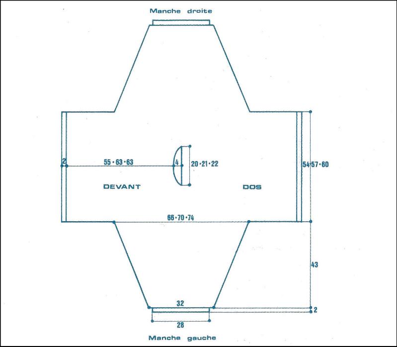 Reprendre les 116 - 132 - 132 m. de gauche, tric. en dim. à droite ts les 2 rgs pour l'encolure devant 1 fs 3 m., 1 fs 2 m., 3 fs 1 m. Cont. droit pendant 30 - 32 - 34 rgs, puis augm. à droite ts les 2 rgs 3 fs 1 m., 1 fs 2 m., 1 fs 3 m.