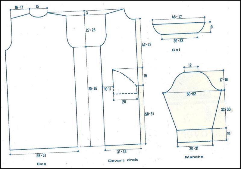 À 50 - 51 cm de haut. tot., laisser les 22 - 24 m. de gauche en attente et tric. droit 15 cm sur les 45 - 47 m. de droite, les laisser en attente. Reprendre les 22 - 24 m. laissées à gauche et tric. droit 15 cm, puis reprendre toutes les m. et cont. droit comme précédemment.