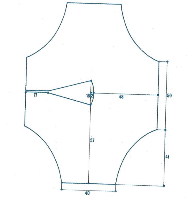 À 57 cm de haut. tot., cont. sur les 80 m. de droite en laissant côté gauche pour l'encolure dos 1 fs 2 m., 1 fs 1 m. à ch. rg. Cont. droit 12 cm, puis augm. à gauche à ch. rg 1 fs 1 m, 1 fs 2 m. Laisser en attente. Reprendre les 80 m. de gauche, croch. en laissant à droite à ch. rg 1 fs 12 m., 5 fs 8 m. et les 28 m. rest.