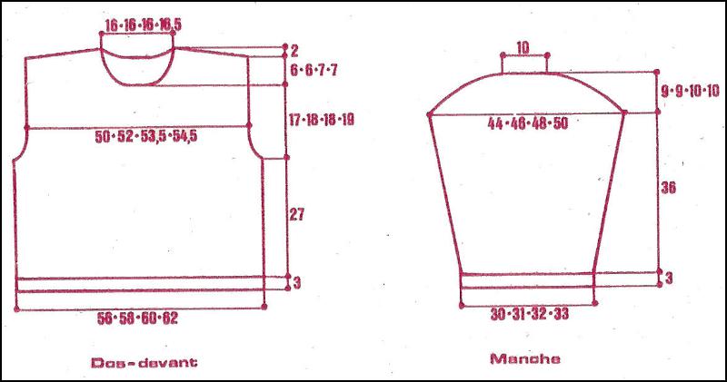 Tric. comme suit: 1 m. lis., 24 - 28 - 32 - 36 m. au point d'astrakan, 16 m. torsade, 16 m. point d'astrakan, 12 m. point d'alvéoles, 17 m. point de blé, 1 m. env., 2 m. torsadées, 28 m. point natté, 2 m. torsadées, 1 m. env., 13 - 15 - 15 - 17 m. point de blé, 1 m. lis.Emmanchures