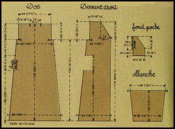 Fonds de poches: relever sur papier fort, d'après le schéma coté aux bonnes mesures, le patron du demi-fond de poche puis, dans la soie, couper 4 fois ce patron, en vis-à-vis 2 par 2. Assembler les fonds de poches, 2 par 2: poser deux fonds l'un sur l'autre, envers contre envers et bords sur bords; piquer à 1/2 cm des bords à fermer, en laissant les bords indiqués "ouverture" sur le schéma. Retourner, pour que l'envers de la soie se trouve à l'extérieur; repasser la couture, puis piquer à nouveau, à 3/4 de cm de la couture précédente; ainsi les fonds sont fermés par une couture anglaise. Surfiler, serré, les bords de l'ouverture.