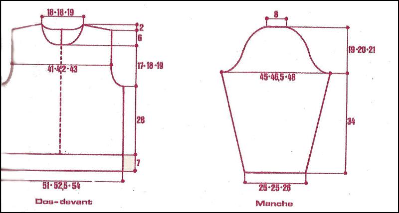 À 17 - 18 - 19 cm de haut. d'emmanchure, rab. les 15 - 15 - 17 m. centrales. Term. ch. partie séparément en rab. côté encolure ts les 2 rgs: 1 fs 4 m., 1 fs 3 m., 2 fs 2 m., 5 fs 1 m.