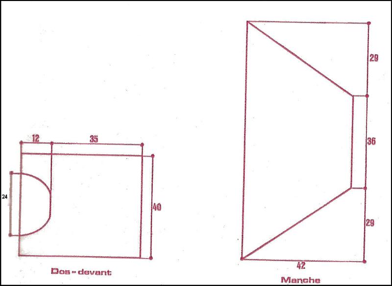 À environ 65 cm de haut. tot., à un même rg qu'à la fin des augm., dim. à droite ts les 2 rgs, 5 fs 1 m., 43 fs 2 m., 1 fs 3 m. Rab. les 4 m. rest. en 1 fois.