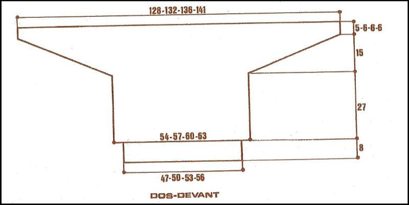 À 51.5 - 53 - 54.5 - 56.5 cm de haut. tot., laisser en attente les 20 - 20 - 22 - 24 m. de gauche. Tric. droit sur les 19 - 19 - 21 - 23 m. de droite pendant 25 - 26 - 27 - 28 cm et laisser en attente. Reprendre les 20 - 20 - 22 - 24 m. de gauche. Tric. comme précédemment en rab. à droite ts les 2 rgs 3 fs 1 m., puis ts les 4 rgs 3 fs 1 m. Cont. droit pendant 8 - 9 - 10 - 11 cm puis augm. à droite ts les 4 rgs 3 fs 1 m., puis ts les 2 rgs, 2 fs 1 m. Reprendre toutes les mailles sur une aig. en augm. encore 1 m. au milieu. Cont. droit pendant 51.5 - 53 - 54.5 - 56.5 cm et rabattre.