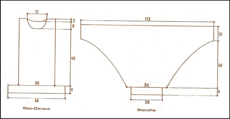 Monter 99 m. Tric. 6 cm en côtes 1/1, laisser en attente 23 m. de ch. côté. Cont. sur les 53 m. centrales en répart. 19 augm. au 1er rg. Tric. comme suit: 38 rgs au point losanges, 44 rgs de torsades en répart. 17 augm. au 1er rg (= 89 m.) (commencer par 3 m. endr., 3 m. env. au lieu de 4. Term. en sens inverse), 38 rgs du point de losanges en répart. 17 dim. au 1er rg (= 72 m.) Term. torsades comme précédemment en répart. 17 augm. au 1er rg.