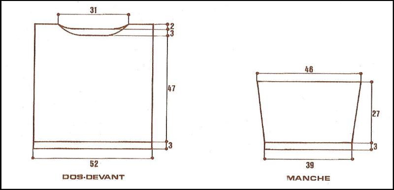 À 50 cm de haut. tot. environ, sur un 35ème rg du point fant., lorsqu'on obtient 44 m. sur l'aig. droite, rab. les 22 m. suiv. en tric. le point normalement, term. le rang. Cont. ch. partie séparément en rab. côté encolure ts les 2 rgs: 1 fs 5 m., 3 fs 3 m., 2 fs m. Rab. les m. rest. en 1 fois sur le 47ème rg du point fant.
