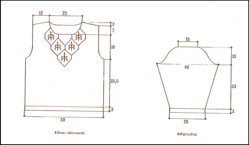 À 18 cm de haut. d'emmanchure environ, après un 28ème rg du point fant., rab. les 29 m. centrales. Term. ch. partie séparément en rab. côté encolure ts les 2 rgs 1 fs 6 m., 1 fs 4 m., 2 fs 3 m., 3 fs 2 m., 2 fs 1 m.