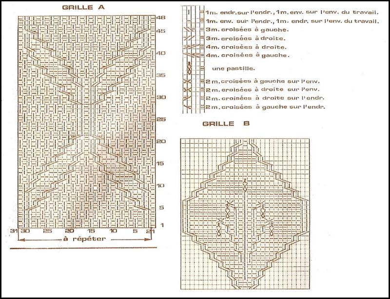 Comme le dos, mais après le 104ème rg du point fant., tric. en suivant la grille "B" sur le motif central. Tric. à nouveau 2 motifs "grille B" de part et d'autre du motif central en commençant les motifs suivants (voir croquis)