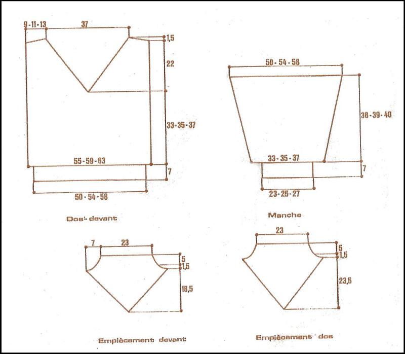 Monter 54 - 58 - 62 m. en CP. Tric. 7 cm en côtes 2/2 en répart. 22 augm. au dernier rg. Cont. jersey endr. sur les 76 - 80 - 84 m. obtenues en augm. de ch. côté