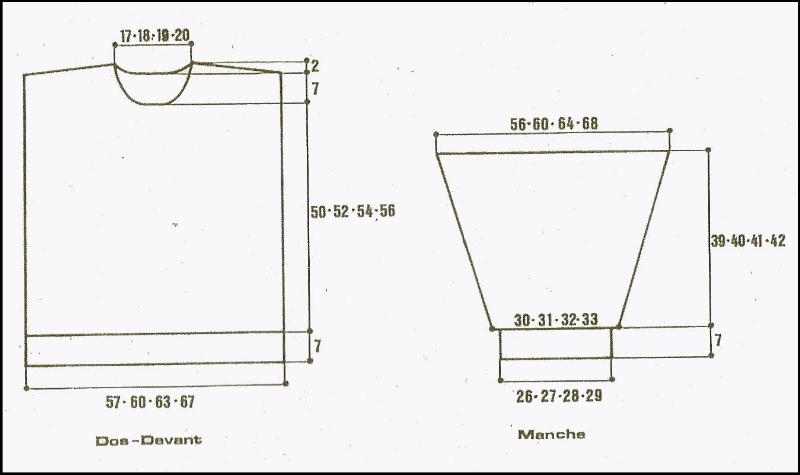 À 57 - 59 - 61 - 63 cm de haut. tot., rab. les 11 - 13 - 15 - 17 m. centrales. Cont. ch. côté séparément en rab. côté encolure ts les 2 rgs: 1 fs 4 m., 1 fs 2 m., 4 fs 1 m. puis ts les 4 rgs: 4 fs 1 m.
