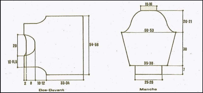 À 27 - 29 cm de haut. tot., après un 20ème rg du point fant., le milieu est atteint. Tric. l'autre moitié en sens inverse, en cont. le point fant. comme précédemment (au 11ème rg du point fant., augm. à gauche pour l'encolure 3 fs 1 m. ts les 6 rgs. Cont. droit) À 47 - 50.5 de haut. tot., après un 7ème - 11ème rg du point fant., rab. à gauche pour l'emmanchure, 1 fs 19 - 22 m., 1 fs 4 m., 1 fs 2 m., 5 fs 1 m. Tric. encore 2 - 4 rgs et rab. les 51 - 53 m. rest. en 1 fois.