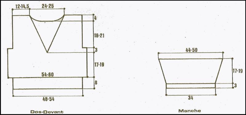 À 18 - 21 cm de haut. d'emmanchures, rab. les 27 - 29 m. centrales. Cont. ch. côté séparément en rab. côté encolure ts les 2 rgs 2 fs 3 m., 3 fs 2 m.