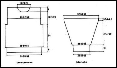 À 19 - 21 - 23 cm de haut. d'emmanchures, rab. les 14 - 15 - 16 m. centrales. Cont. ch. côté séparément en rab. côté encolure ts les 2 rgs 1 fs 4 m., 1 fs 2 m., 4 fs 1 m.