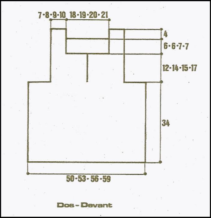 Le long de la partie verticale des emmanchures et contre les 36 m. laissées à l'emmanchure crocheter 1 rg de m.c. et 1 rg de m.s. (le long de la partie verticale, croch. environ 160 - 180 - 190 - 210 m.s.) puis le long de la partie verticale des emmanchures crocheter 12 rgs du point d'arceaux.